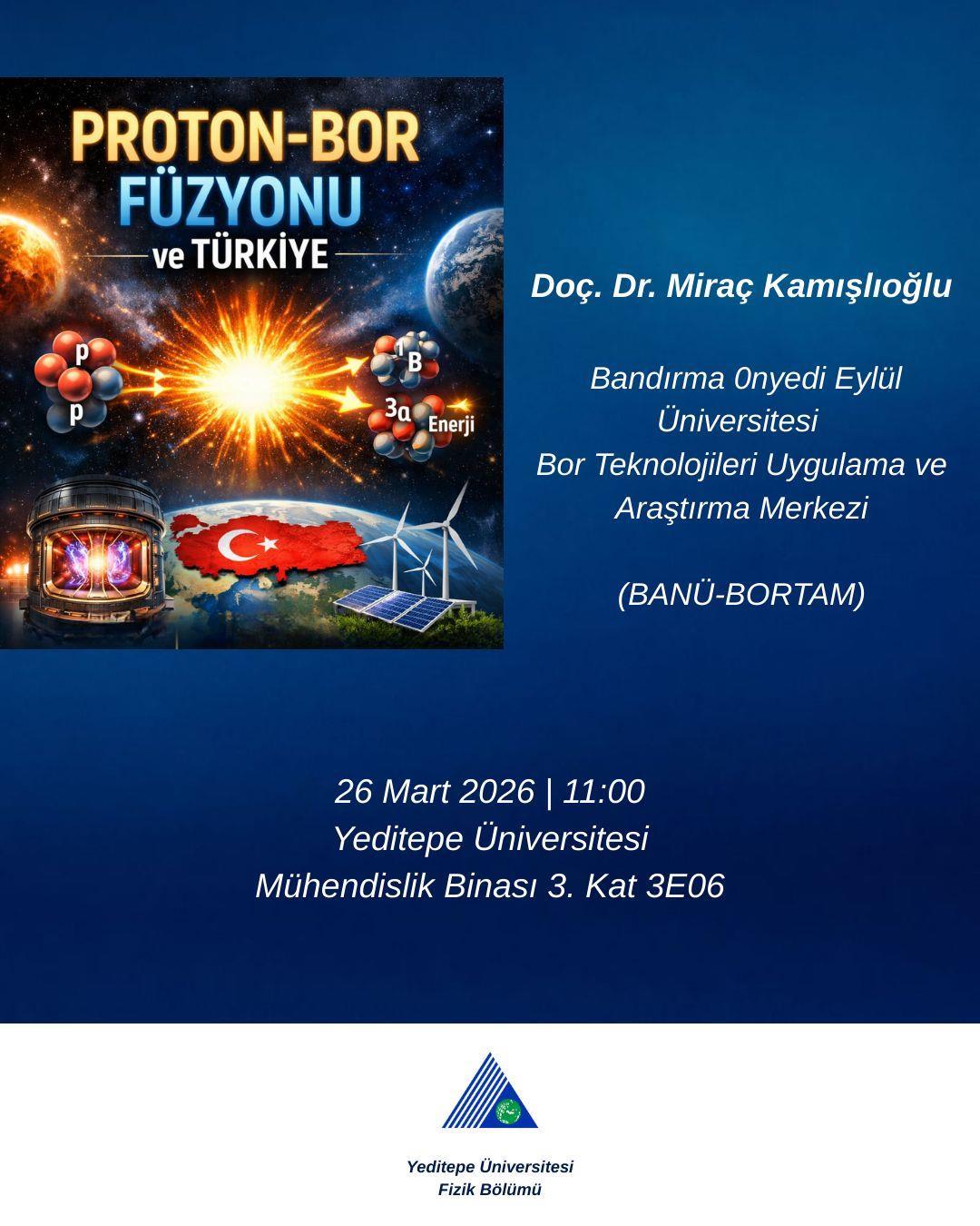 Our faculty member Assoc. Prof. Dr. Bülent BÜYÜK gave a presentation titled "Proton-Boron Fusion and TURKEY" at the Department of Physics, Yeditepe University, within the scope of the Türkiye FÜZYILI Seminars.