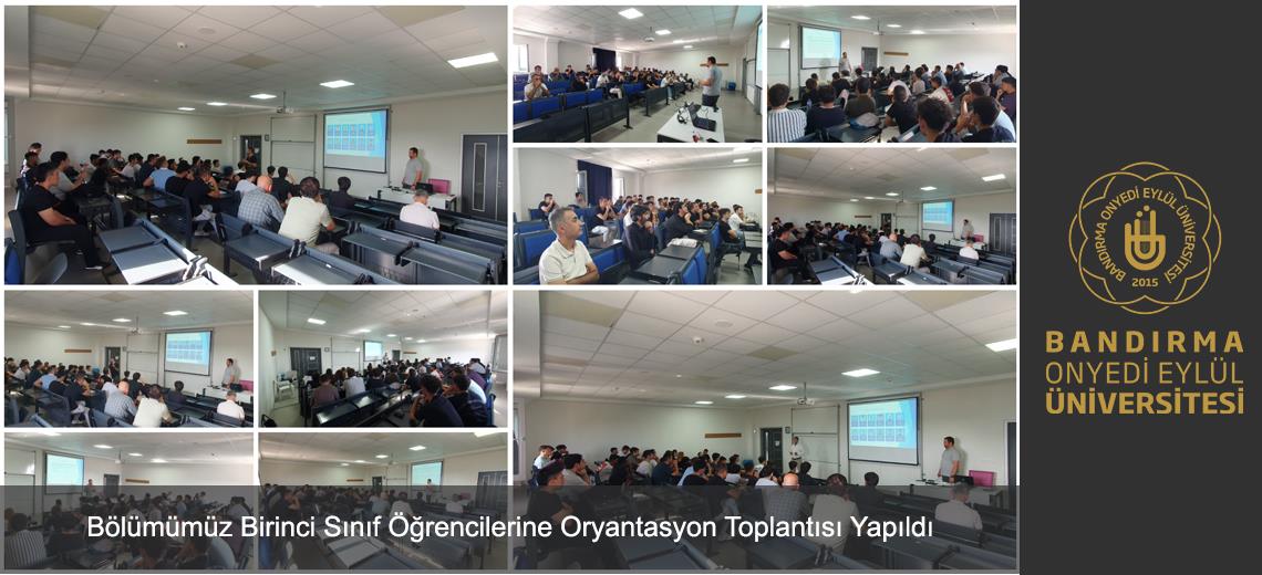 Bölümümüz birinci sınıf öğrencilerine Sayın Dekanımız Prof. Dr. Abdullah YEŞİL'in, Sayın Bölüm Başkanımız Prof. Dr. Muhammet Nuri SEYMAN'ın ve bölümümüz öğretim elemanlarının katılımıyla oryantasyon toplantısı yapılmıştır. Toplantı, öğrencilerimize eğitim hayatları boyunca faydalı olabilecek bilgiler verilerek ve öğrencilerimizle soru-cevap şeklinde fikir alışverişi yapılarak gerçekleştirilmiştir. Toplantının sonunda öğrencilerimize anket yapılarak toplantıdan duydukları memnuniyet ölçülmüştür.