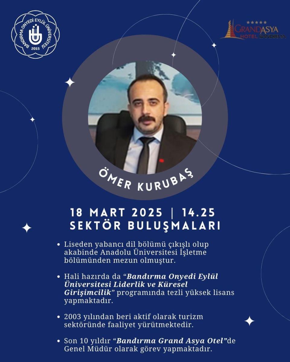 Bölümümüz öğretim üyelerinden Doç. Dr. Özer YILMAZ tarafından verilen 3. sınıf seçmeli derslerimizden “Sektör Buluşmaları” kapsamında, Bandırma Grand Asya Hotel Genel Müdürü Sn. Ömer KURUBAŞ dersimize konuk olmuştur.