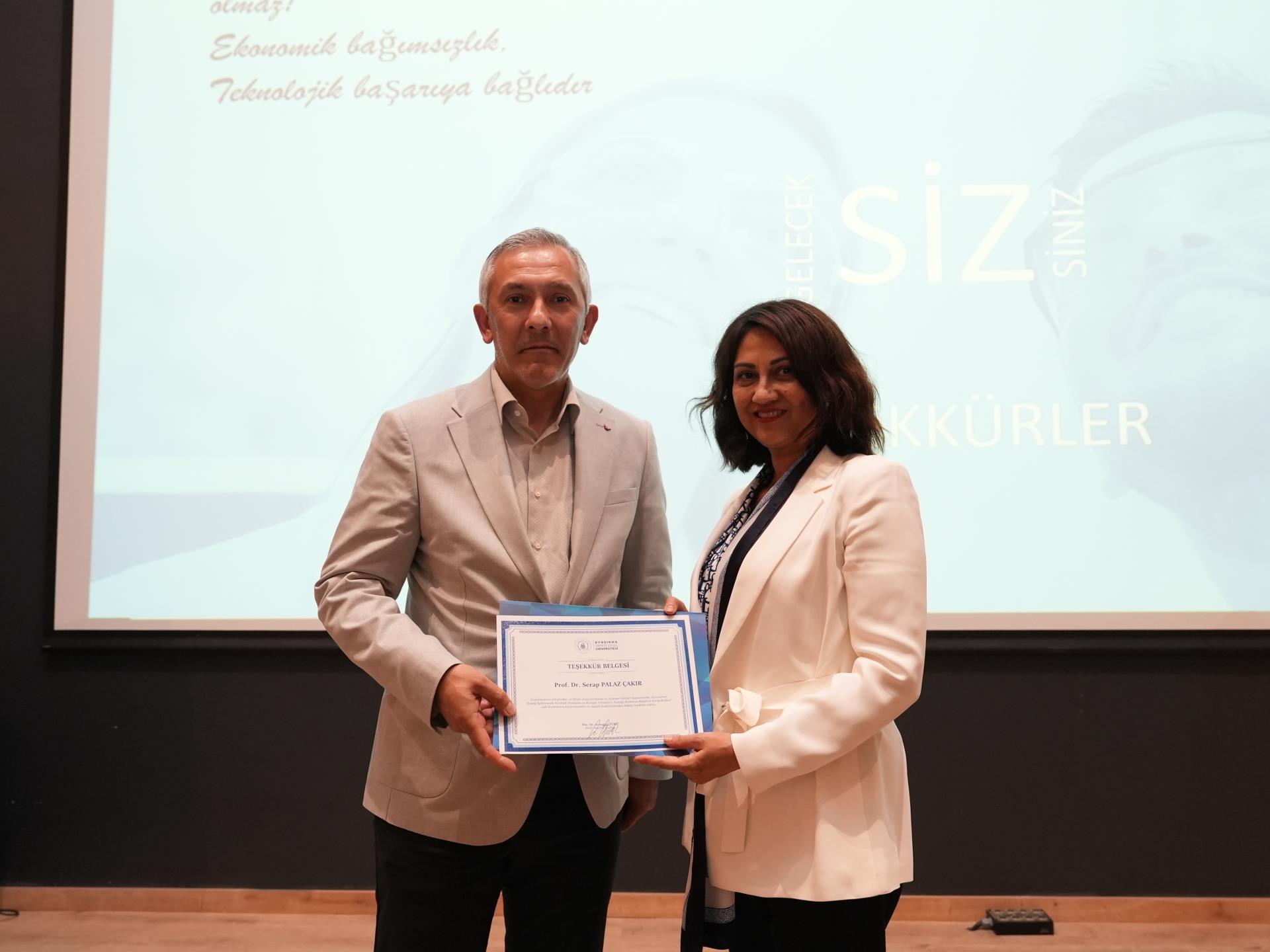 "Enerji Sektöründe Stratejik Dönüşüm ve Kariyer Fırsatları: Sanayi, Kamu ve Akademi Perspektifleri" başlıklı konferans, İşbir Elektrik Genel Müdürü İbrahim KILIÇARSLAN'ın renkli sunumuyla gerçekleştirildi. Etkinliğe Dekanımız Prof. Dr. Serap PALAZ ÇAKIR'da katıldı.Gençlerimize ilham ve motivasyon kaynağı olan değerli katkılarından dolayı Sayın KILIÇARSLAN'a içten teşekkürlerimizi sunuyoruz.