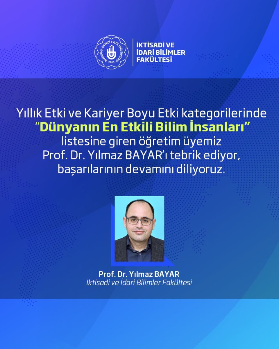 Stanford Üniversitesi tarafından hazırlanan 2024 yılı ilk %2'lik dilime giren "En Etkili Bilim İnsanları" listesinde İktisadi ve İdari Bilimler Fakültemiz Öğretim Üyesi Prof. Dr. Yılmaz Bayar yer alarak önemli bir başarıya imza atmıştır. Hocamızı başarılı çalışmalarından dolayı tebrik ederiz.
