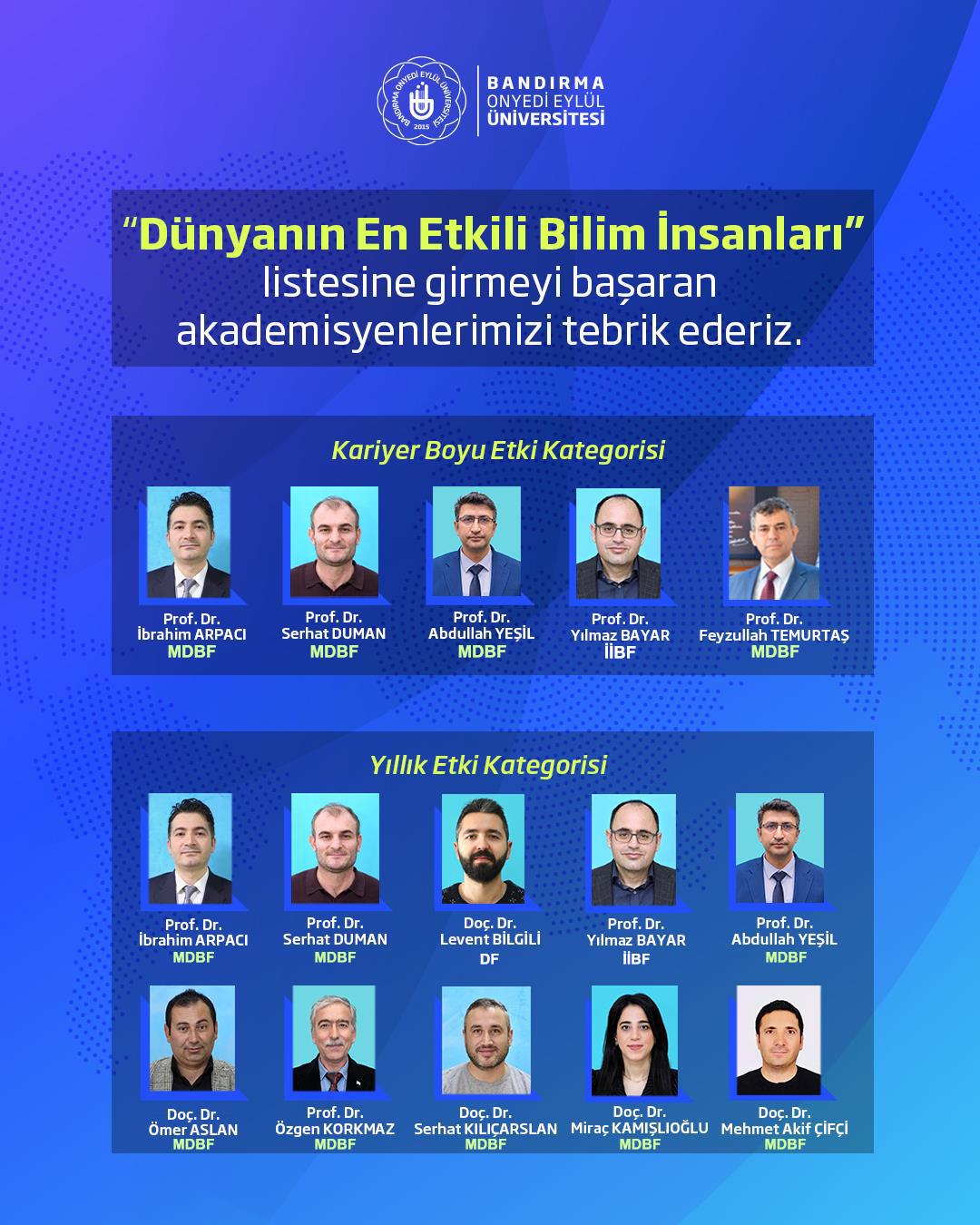 Kariyer Boyu Etki kategorisinde; Prof. Dr. Abdullah Yeşil, Prof. Dr. İbrahim Arpacı, Prof. Dr. Serhat Duman ve Prof. Dr. Feyzullah Temurtaş listede yer alma başarısı göstermiştir.