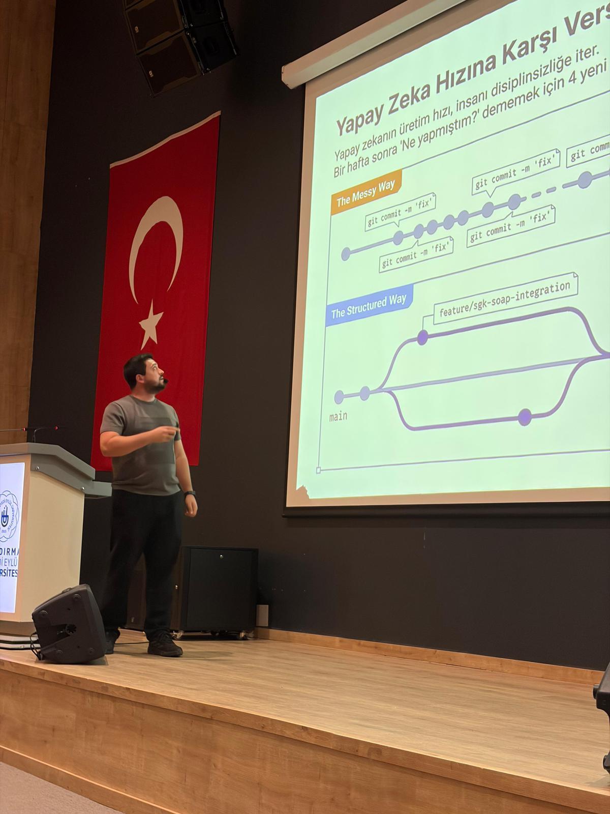 Bandırma Onyedi Eylül Üniversitesi Yazılım Mühendisliği Topluluğu tarafından organize edilen etkinlikte; yapay zekâ destekli kod yazımı, hızlı ürün geliştirme süreçleri, farklı yapay zekâ modellerinin birlikte çalışması ve sektördeki dönüşüm gibi konular ele alındı.