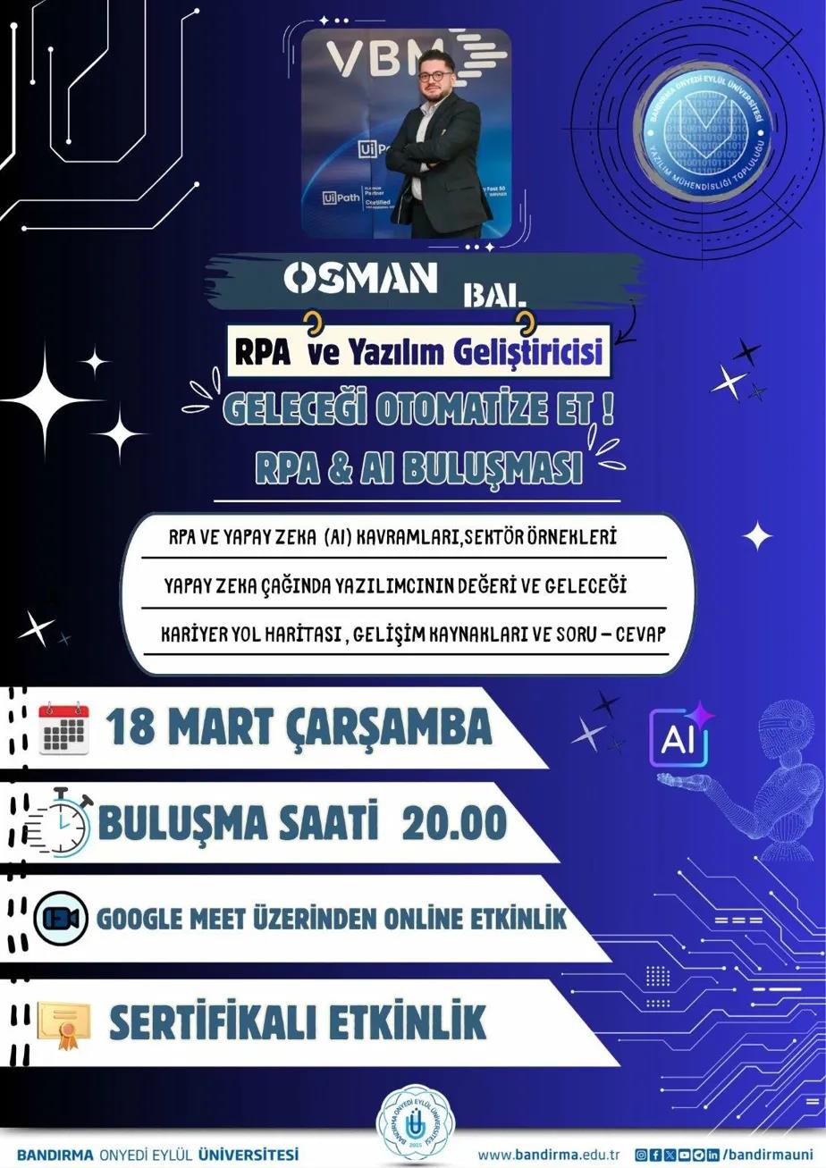 Bandırma Onyedi Eylül Üniversitesi ev sahipliğinde düzenlenen “RPA ve Yapay Zeka (AI) Buluşması: Geleceği Otomatize Et” başlıklı etkinlik, yoğun katılımla çevrim içi olarak gerçekleştirildi. Etkinlikte, RPA ve Yazılım Geliştiricisi Osman Bal, robotik süreç otomasyonu (RPA) ve yapay zeka teknolojilerinin günümüzdeki yeri, sektörlerdeki uygulama alanları ve gelecekteki potansiyeli hakkında kapsamlı bilgiler paylaştı. Katılımcılar, teorik bilgilerin yanı sıra gerçek proje örnekleri üzerinden bu teknolojilerin iş dünyasında nasıl kullanıldığını yakından inceleme fırsatı buldu. Seminer kapsamında ayrıca, yapay zeka çağında yazılım geliştiricilerin rolü, değişen iş dinamikleri ve bu alanda kariyer yapmak isteyenler için izlenebilecek yol haritaları ele alındı. Katılımcılar, alanında uzman konuşmacıya yönelttikleri sorularla interaktif bir öğrenme deneyimi yaşadı. Google Meet üzerinden gerçekleştirilen etkinlikte, teknolojinin geleceğine ilgi duyan öğrenciler ve profesyoneller bir araya gelerek bilgi ve deneyim paylaşımında bulundu. Program sonunda katılımcılara sertifika takdim edildi. Bu tür etkinliklerle öğrencilerin güncel teknolojiler hakkında bilgi edinmesini destekleyen Bandırma Onyedi Eylül Üniversitesi, geleceğin mesleklerine yönelik farkındalık oluşturmaya devam ediyor.