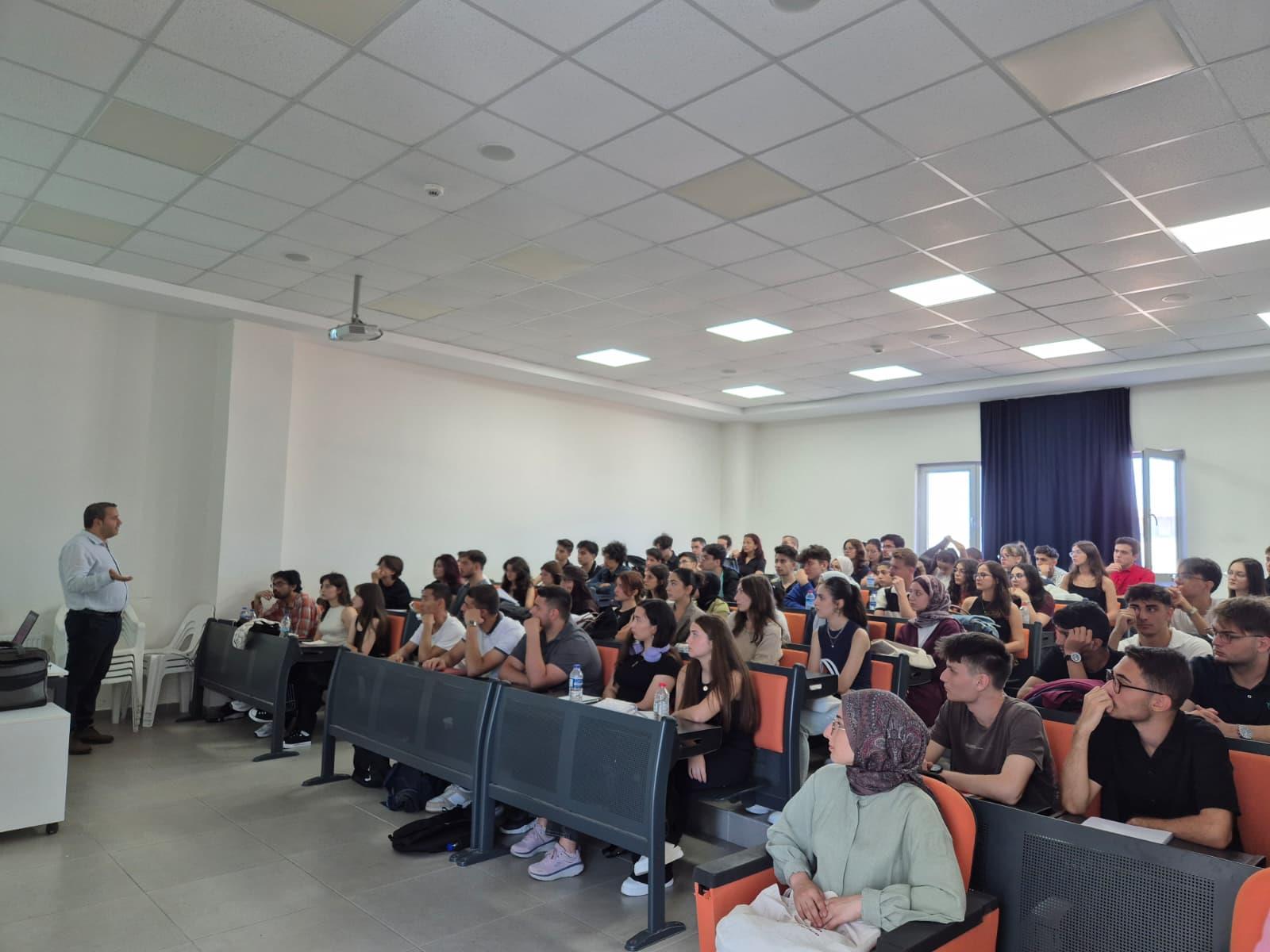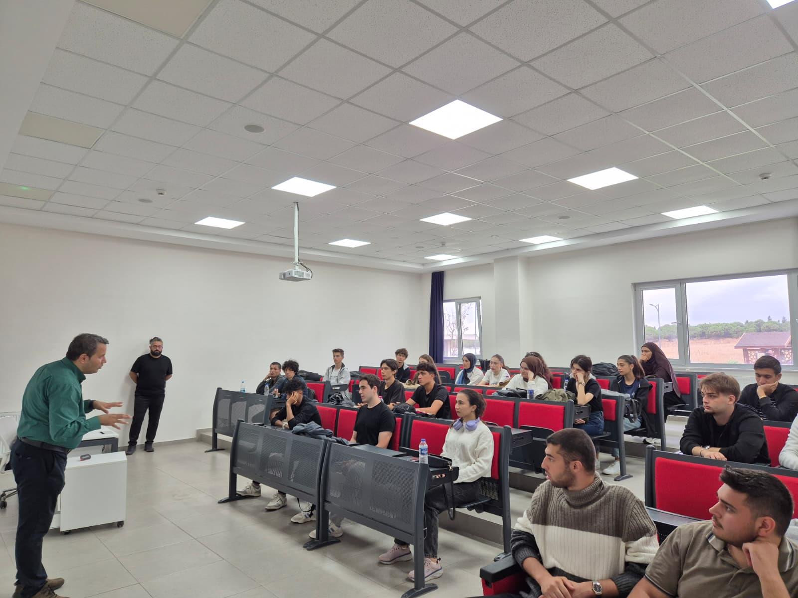 Cuma günü gerçekleştirilen ikinci toplantıda ise 1. sınıf öğrencilerimizle bir araya gelindi. Toplantıya Dekan Yardımcımız Dr. Öğr. Üyesi Fahrettin Burak DEMİR de katılım sağladı. Bu oturumda, MÜDEK kapsamında yürütülen akreditasyon çalışmaları ve öğrencilerin sürece katkı sağlayabileceği alanlar üzerinde duruldu. Öğrencilerimize kariyer planlamaları ve mezuniyet öncesinde dikkat etmeleri gereken hususlar aktarılırken, toplantı katılımcıların soruları ve görüşleriyle interaktif bir şekilde tamamlandı.